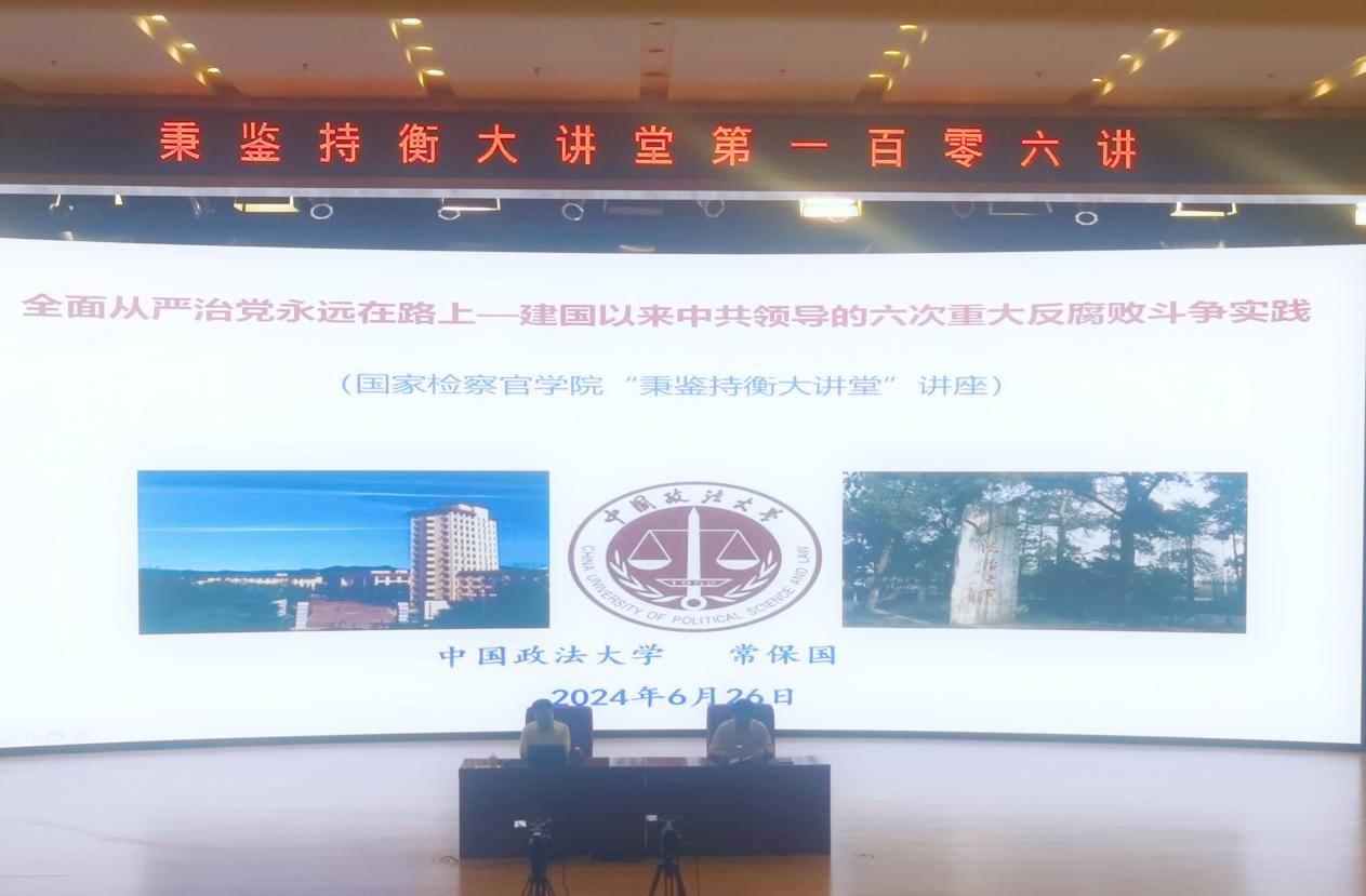 6月26日,國家檢察官學(xué)院在沙河校區(qū)成功舉辦秉鑒持衡大講堂第一百零六講,特邀中國政法大學(xué)黨委常委、副校長、紀(jì)檢監(jiān)察學(xué)院院長常保國教授講授“全面從嚴(yán)治黨永遠(yuǎn)在路上——建國以來中國共產(chǎn)黨領(lǐng)導(dǎo)的六次重大反腐敗斗爭實(shí)踐”。