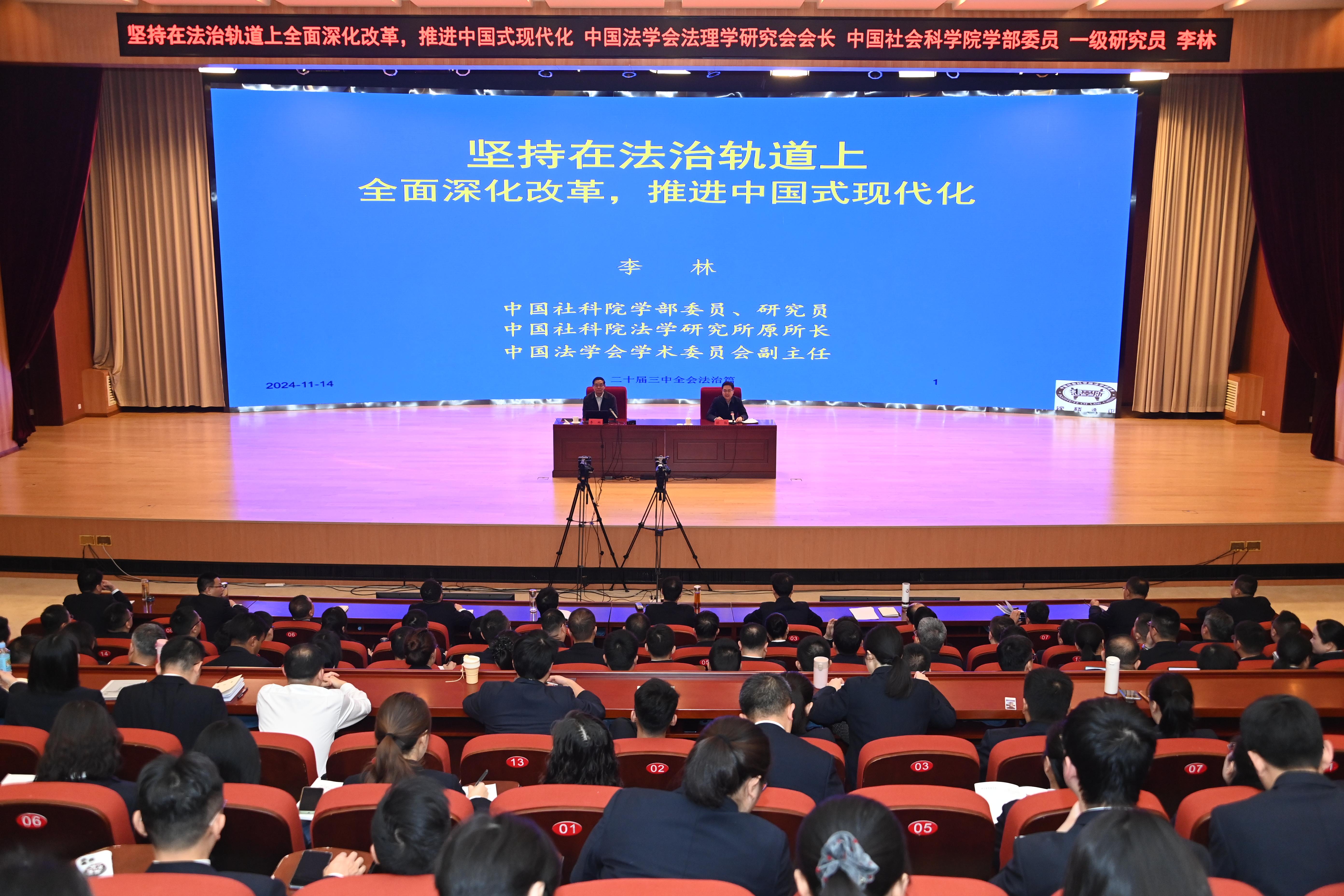 李林研究員圍繞《中共中央關(guān)于進(jìn)一步全面深化改革、推進(jìn)中國(guó)式現(xiàn)代化的決定》通篇彰顯法治精神、法治是中國(guó)式現(xiàn)代化的重要保障、堅(jiān)持處理好改革和法治的關(guān)系、完善中國(guó)特色社會(huì)主義法治體系四個(gè)方面,系統(tǒng)闡述了黨的二十屆三中全會(huì)關(guān)于全面深化法治領(lǐng)域改革的整體部署及重大意義。