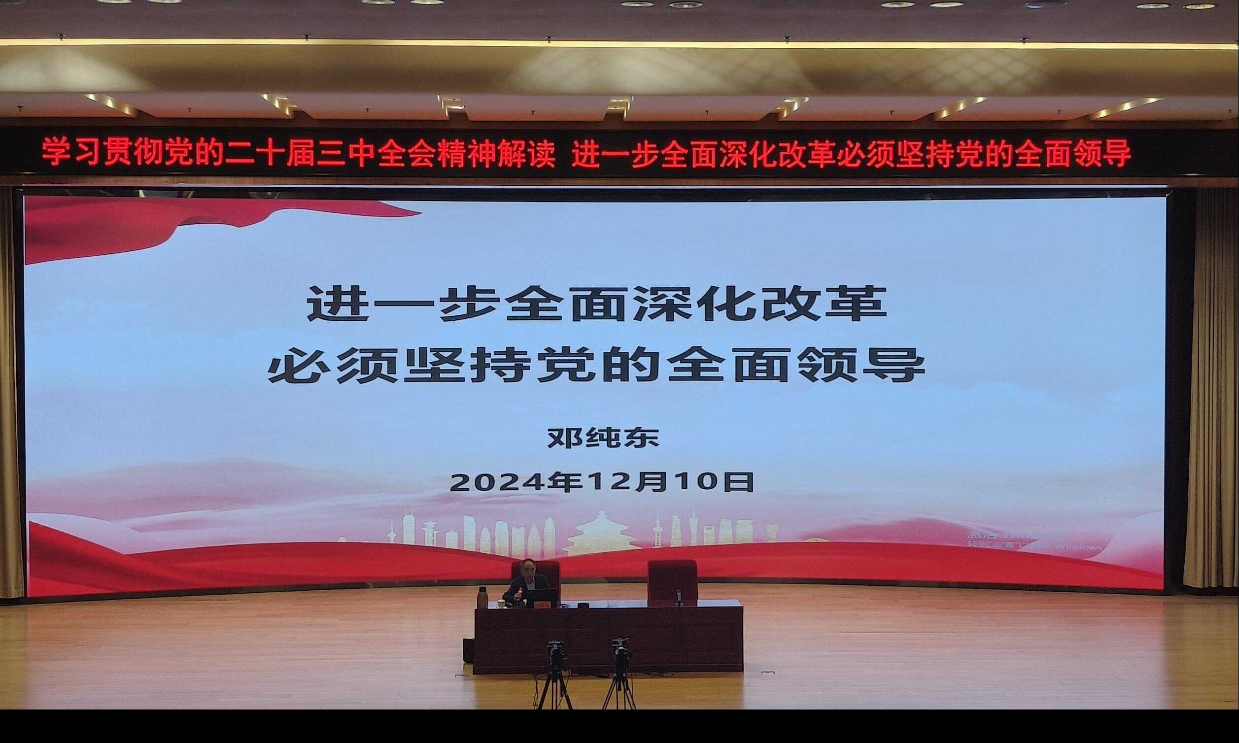 12月10日上午,學(xué)院在沙河校區(qū)舉辦秉鑒持衡大講堂第一百一十五講。本次大講堂邀請中國社會科學(xué)院馬克思主義研究院原書記、院長鄧純東教授講授“學(xué)習(xí)貫徹黨的二十屆三中全會精神解讀 進(jìn)一步全面深化改革必須堅(jiān)持黨的全面領(lǐng)導(dǎo)”。