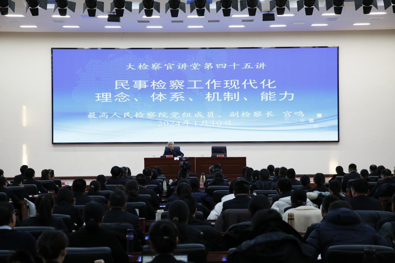 2024年1月9日上午,國家檢察官學(xué)院舉辦大檢察官講堂第四十五講,最高人民檢察院黨組成員、副檢察長、二級大檢察官宮鳴圍繞“民事檢察工作現(xiàn)代化:理念、體系、機制、能力”主題授課。