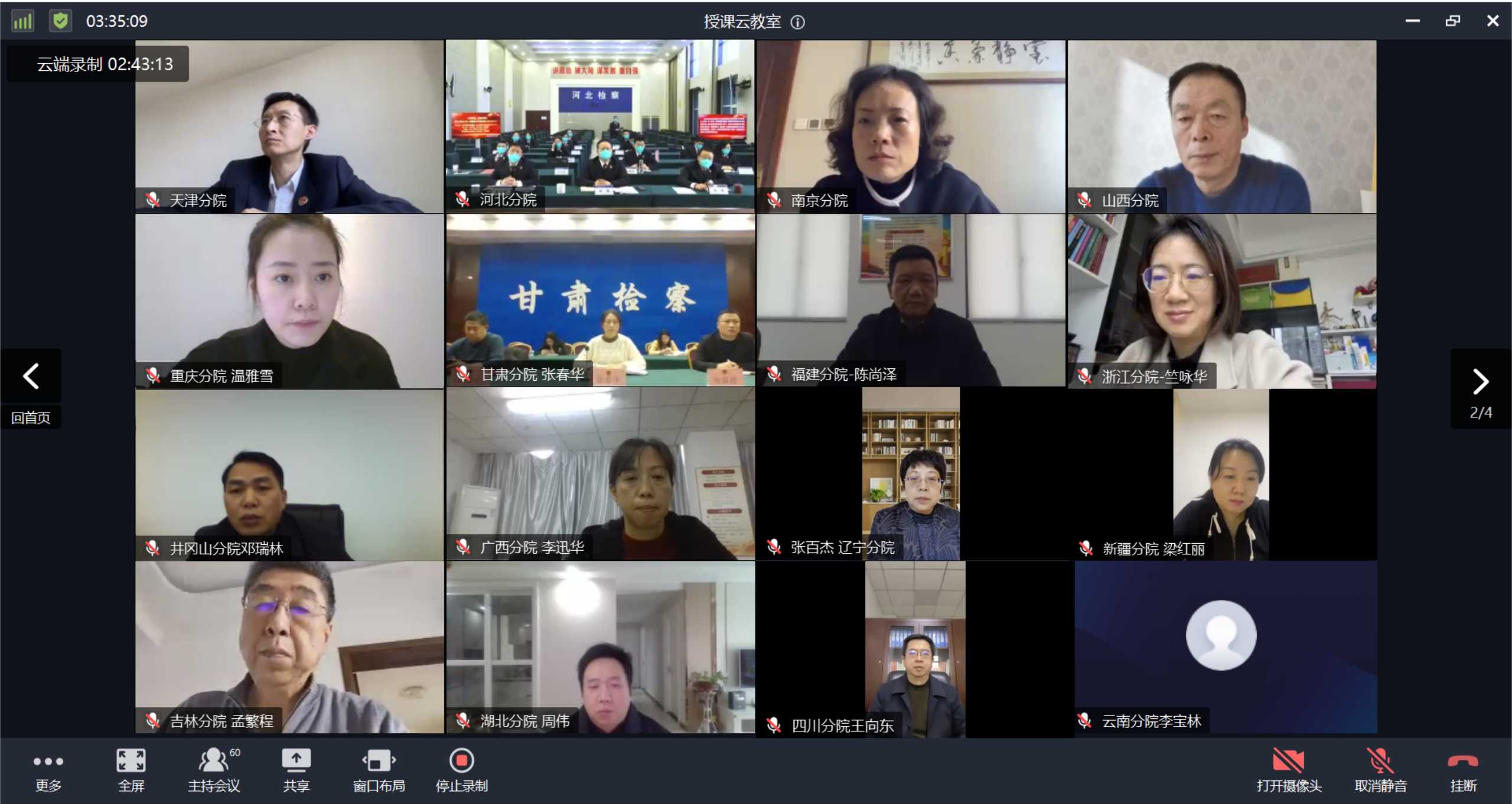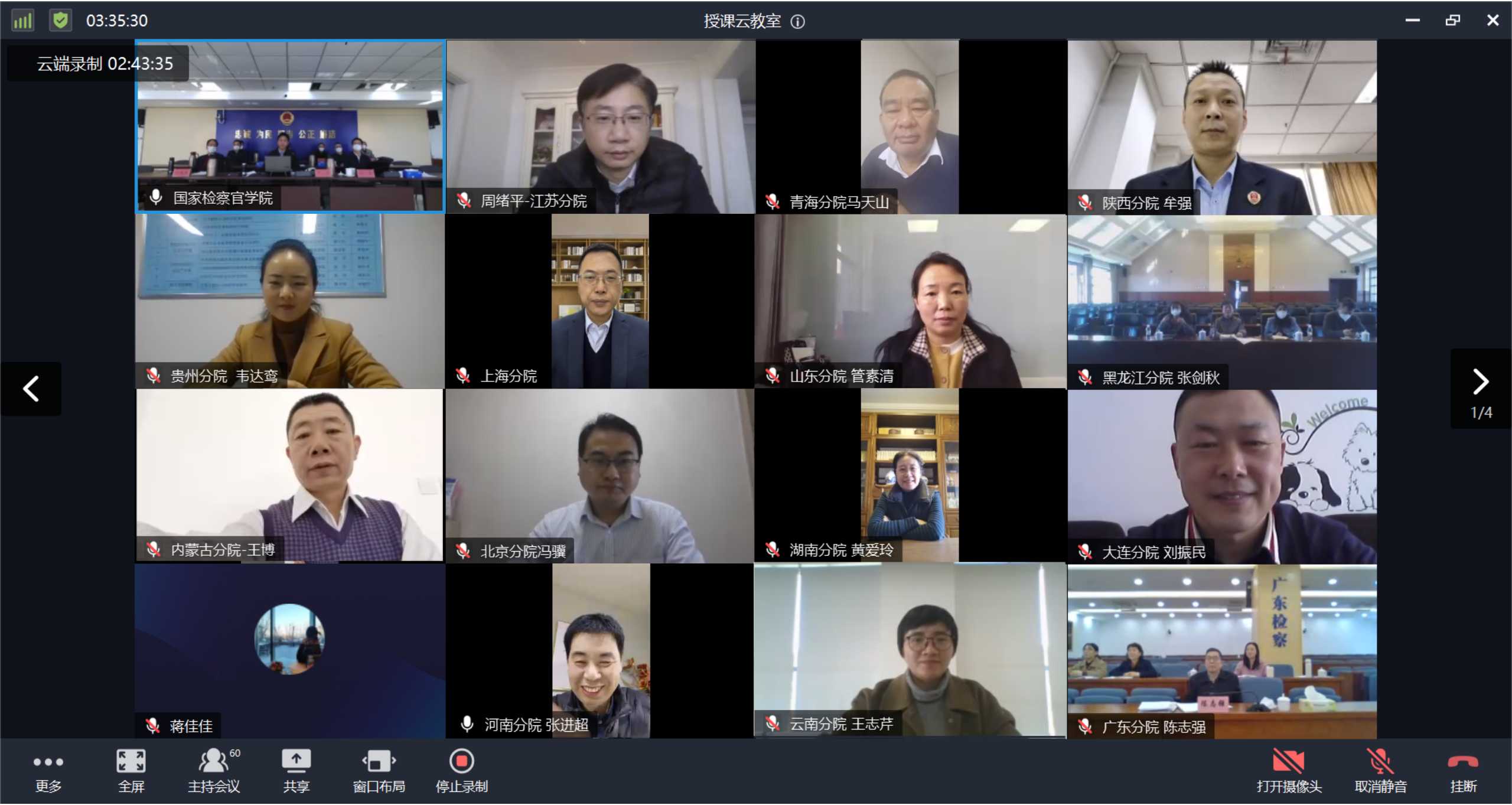 1月15日上午,國家檢察官學院和全國30個分院視頻連線,互致問候、共敘友情、共話合作。學院黨委書記鄧云主持會議并作總結(jié),學院黨委副書記、院長孫勤致辭。學院黨委副書記、二級教授楊迎澤,黨委委員、副院長周洪波、朱全景,黨委委員、紀委書記王蜀青,黨委委員、工會主席陳航,紀委副書記王振平,黨委委員、總務(wù)長鄭永芳,四級職員應(yīng)鶯在沙河校區(qū)主會場參會;30個分院負責人、相關(guān)同志和國家檢察官學院各部室負責人在線參加會議。
