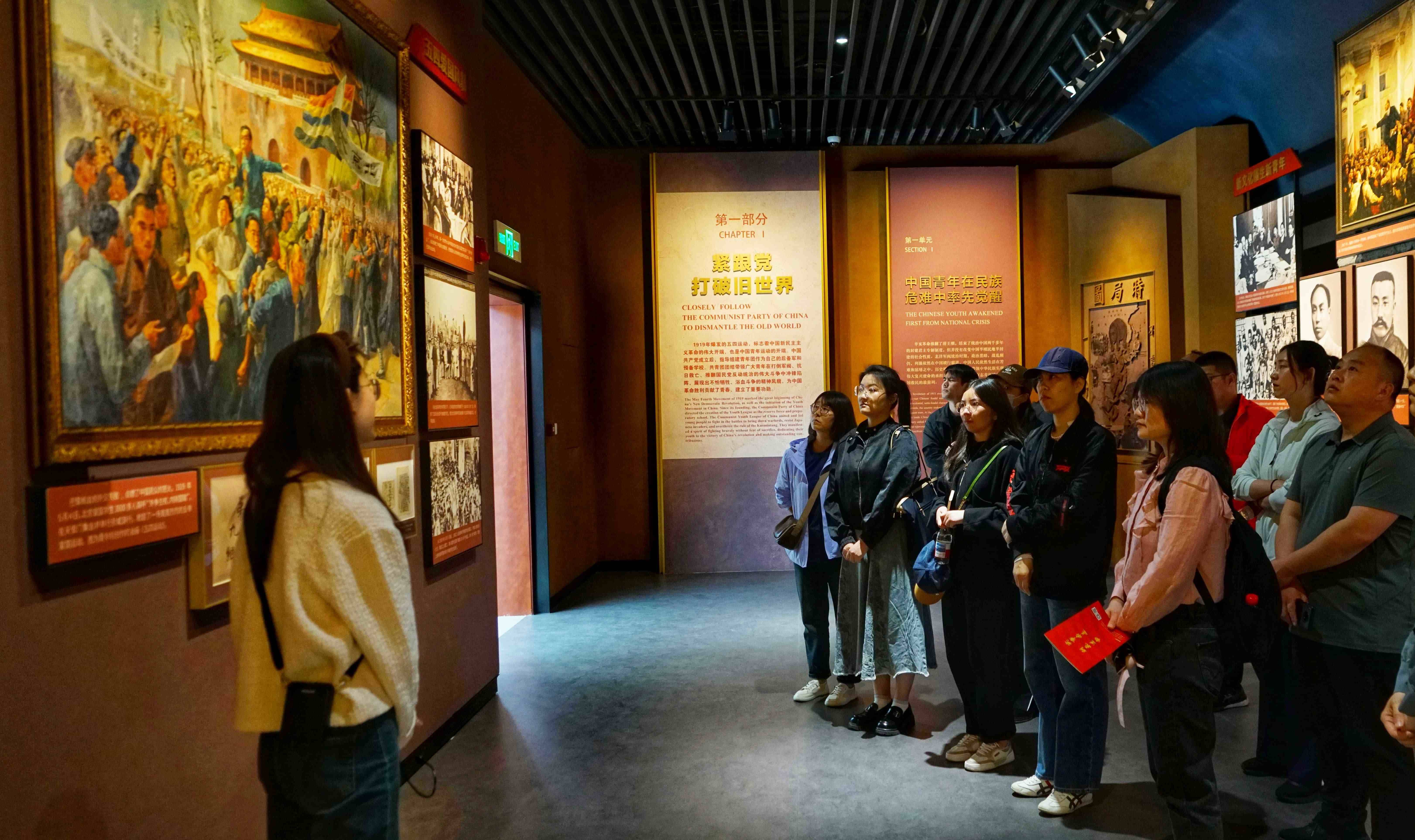 展覽以“中國青年在黨的領(lǐng)導(dǎo)下為實現(xiàn)中華民族偉大復(fù)興而不懈奮斗”為主題,分為“緊跟黨打破舊世界”“追隨黨建設(shè)新中國”“聽黨號召搏擊改革潮”“青春向黨奮進(jìn)新時代”四個部分。從展廳外的巨幅國畫《五四青春志》出發(fā),伴隨講解員深入細(xì)致的介紹,大家觀看了《五四運動》油畫、各種版本的《共產(chǎn)黨宣言》、團一大會議簽到簿、黨和國家領(lǐng)導(dǎo)人對團旗樣式做出的批示、“威五”長征五號遙三飛行任務(wù)青年突擊隊旗等珍貴史料,聆聽了一代代青年緊跟著黨、為實現(xiàn)民族復(fù)興不懈奮斗的故事,重溫了黨領(lǐng)導(dǎo)的中國青年運動百年歷程和壯闊征程。展覽中的志愿者服務(wù)、“青少年維權(quán)崗”等圖文介紹,引發(fā)了大家對自身經(jīng)歷的回憶和職責(zé)使命的思考。
