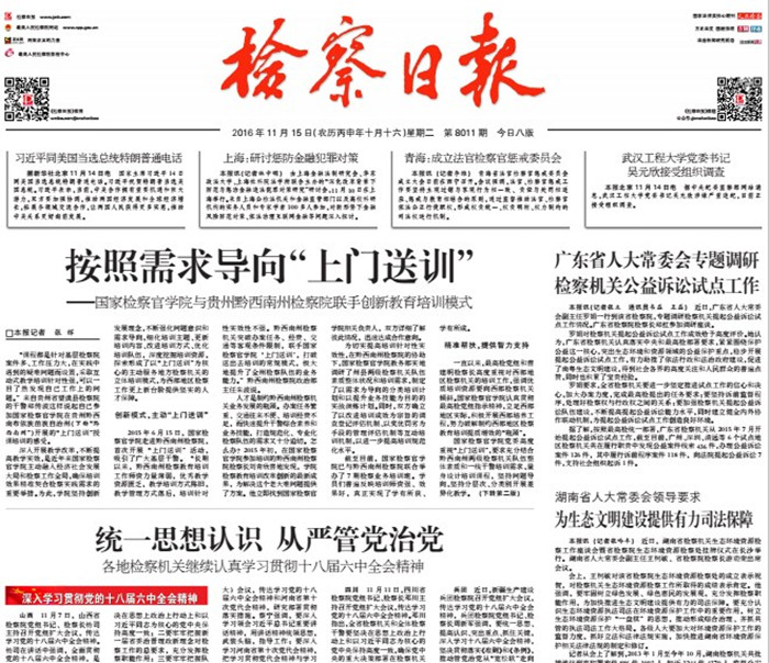 2015年6月15日,國家檢察官學(xué)院走進(jìn)黔西南州檢察院,首次開展“上門送訓(xùn)”活動,吸引了廣大基層干警。“長期以來,黔西南檢察教育培訓(xùn)工作師資力量薄弱,優(yōu)秀教學(xué)資源匱乏,教學(xué)培訓(xùn)方式陳舊,教學(xué)管理方式落后,培訓(xùn)針對性實(shí)效性不強(qiáng)。黔西南州檢察機(jī)關(guān)突破辦案任務(wù)、經(jīng)費(fèi)、交通等客觀條件限制,聯(lián)手國家檢察官學(xué)院‘上門送訓(xùn)’,打破送出去培訓(xùn)的常規(guī)模式,極大地提升了全州檢察隊(duì)伍的辦案能力。”黔西南州檢察院政治部主任朱波說。